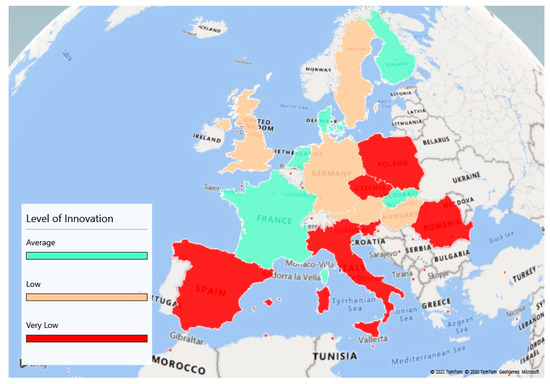 After establishing a final score (of innovation, efficiency, and sustainability) for a country, a color was assigned to the score, according to the described level fitting one of the five ranges.