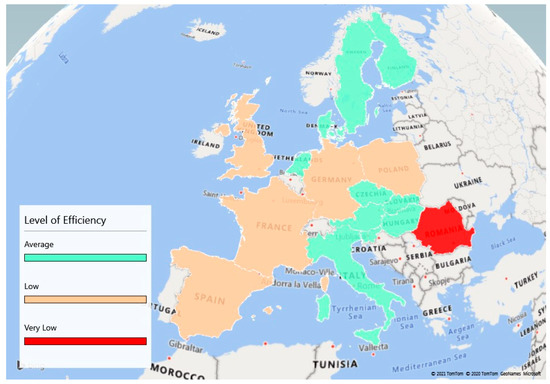 Moving on to the second dimension, Efficiency, it is widely known that it represents the ability to achieve a desired level of performance by using the least number of inputs in order to obtain the highest amount of output [58]. Based on information given in Table 4, we managed to create a map revealing the distribution of countries according to their efficiency level in Figure 3.