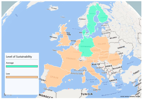 As Figure 4 shows, countries from northern Europe have a high level of sustainability in the bioenergy field, above average, while red represented countries have a low level of sustainability in the bioenergy field, with the mention that values are not very different from one country to another, as reported in Table 5.