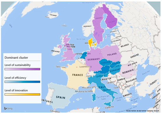 Figure 6 is a graphical representation of the analyzed countries based on the dominant component of bioenergy performance treated in this paper. By dominant component, we understand the dimension in which a country holds the best score. As we can see, northern Europe and several countries from central Europe hold supremacy in the sustainability dimension, having good performance for indicators included in this category. Represented by yellow, Denmark is the only country from the group of 16 that has a higher value for indicators regarding innovation, being followed by France, while several countries from Central Europe and Sothern Europe hold supremacy for Efficiency.