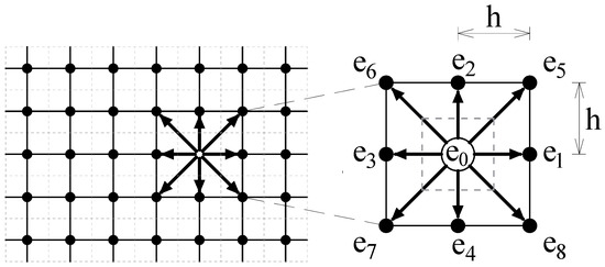 In LBM, the fluid flow is divided into fictitious particles forming a uniform square-shaped grid. The flow propagates through the grid, one node at a time-step and collides with other flow particles along the way. These “streaming” and “collision” steps simulate the macroscopic behavior of the fluid flow. In general, the virtual fluid particles have infinite degrees of freedom. However, for simplification, a reduced number of degrees of freedom is considered and the particle momentum is discretized. It means that the emission of these particles occurs only in specific directions regarding the regular square grid network. Figure 1 shows an example of lattice network and the unit velocity vectors () for each node in this network, representing the degrees of freedom of the fluid particles. This figure is related to a nine-speed network in two dimensions, called D2Q9, a commonly used velocity set in 2D models.