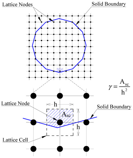 The IMB method uses a modified LB equation. In this method, the standard collision operator of LBM is altered by adding an additional collision term, . This new term is used to approximate the complex solid boundaries on lattice nodes so that the boundaries of solid particles are smoothly represented in the regular grid network. This representation is characterized based on a parameter called solid ratio, introduced for each computational lattice cell as shown in Figure 2. This parameter is defined as the area occupied by a solid phase, (the hatched area in Figure 2), to the total cell area ().
