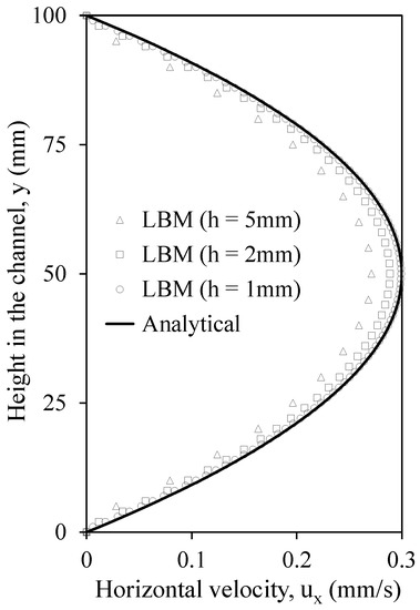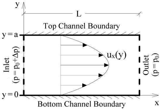 Here, a pressure-driven Poiseuille channel flow (as shown in Figure 3) with the parameters listed in Table 1 is modeled, and the results are compared with the analytical results from Equation (18). Note that the value of pressure difference is opted to result in a Reynolds number of 1.
