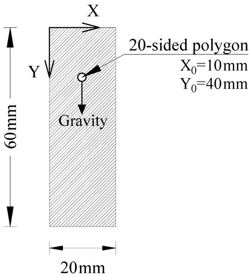 A similar problem, the sedimentation process of a single solid particle in a fluid-filled vertical container under its gravity is simulated using the developed program, and the results are compared with the studies mentioned earlier. The geometry of the container and the initial location of the particle is demonstrated in Figure 5. All four boundaries of the square-shaped container are no-slip walls imposing the simple bounce-back rule to the fluid particles. Similar characteristics are considered for the model to maintain comparability with the previous studies. The fluid density, kinematic viscosity, and particle density are 1000 kg/m3, m2/s, and 1250 kg/m3, respectively. A lattice spacing of h = 0.1 mm is used and the relaxation time is set to τ = 0.65. As the developed computer program (BDL2D) can only model polygon solid particles, a 20-sided regular polygon as a pseudo-circular particle is introduced in the model to resemble the circular one. The reason for using a regular polygon with multiple sides is its geometrical resemblance to a circle. The polygon dimensions were chosen to be inscribed in the corresponding circle with 2.5 mm diameter, same as the settling particle in Wu et al. [69].