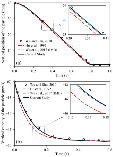 The sedimentation of a circular particle in a confined channel has been studied as a validation case for many numerical methods. Hu et al. [67] and Wu and Shu [68] studied this problem using an arbitrary Lagrangian–Eulerian finite element method and implicit IBM-LBM, respectively. Wu et al. [69] also modeled the same problem using coupled DEM-LBM with multiple boundary schemes, including the IMB method.