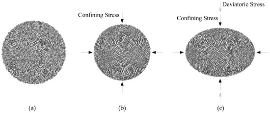 Biaxial test steps: (a) Particle generation; (b) initial compaction, bonding, and confining stress; (c) deviatoric stress step.