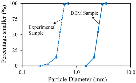 In the current biaxial studies, 2000 octagonal (regular eight-sided polygon) particles with relatively uniform sizes are generated. Compared to circular particles used in previous numerical studies, the particles’ octagonal shape can mimic the increased interlocking of actual irregular-shaped sand particles as most of the grains in natural sandstones are angular [3]. On the other hand, the roundness of octagonal particles helps avoid induced anisotropy in the model [46]. The particle diameters range from 3.56 to 2.14 mm. The particle size distribution of the particle assembly is demonstrated in Figure 8. To reduce the number of DEM particles and, therefore, the computation cost, the sand particle sizes in the experimental study of Younessi et al. [29] are magnified by a factor of 5. The planar void ratio of the particle assembly is 0.20 after the initial compaction. The boundary stress at the initial compaction step was 12.5 kPa. The stress was kept constant during the bond generation step when three different bond strengths (50, 500, and 5000 N) were applied to particle contacts of three sets of models. After that, each set of bonded models and unbonded particle assembly were subjected to 50 and 100 kPa isotropic stresses during the confining stress step. Each model is then subjected to deviatoric stress caused by vertical compression, and their stress–strain behaviors are recorded. Table 2 shows the DEM parameters used in the simulation of biaxial tests. The particles’ stiffnesses are somewhat higher than the corresponding values in similar studies, mostly to avoid excessive overlaps between particles [70].