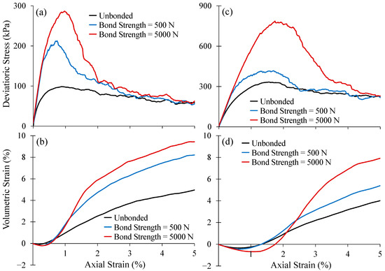 The simulation results of biaxial tests are shown in Figure 9 in terms of the deviatoric stress versus axial strain (in-plane vertical direction) and the volumetric versus axial strain. The results are provided for the models with different bonding strengths (for brevity, the results of the 50N-bond model are not presented) for two confining stresses of 50 and 100 kPa. The results of the unbonded model are also provided as a reference. Both stress–strain and volumetric behavior of bonded models agree with the findings of previous experimental [71,72,73] and numerical studies [51,52,53]. It can be observed that the developed model successfully captures the main features of the behavior of cemented soils, including enhanced strength [74,75,76], more brittle stress–strain behavior, and a more dilative volumetric response [71,72,73], which are all more pronounced when more cement contents (corresponding to stronger bonds [51,52]) are present in the sample [72].