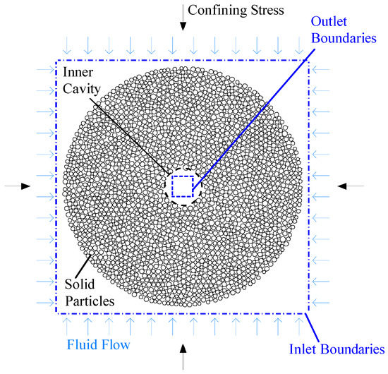 After the cavity is formed, a TWHC test is simulated on the model. Similar to the typical procedure used in many experimental studies [2,3,27,80], the test simulation consists of the incremental increase of confining stress in multiple steps, and each step is followed by an inward fluid flow with variable pressure gradients. Complex fluid open boundaries (inlets and outlets) are avoided as they are defined by straight boundaries. The flow inlets are modeled as square-shaped boundaries slightly smaller than the inner cavity. The flow outlets also form a square with dimensions slightly larger than the initial outer diameter of the particle assembly. A similar approach was employed by Zhao et al. [81] to simulate radial flow in 2D ring-shaped samples. Figure 10 shows the model characteristics, including geometry, loading conditions, and fluid boundaries in sand production numerical models.
