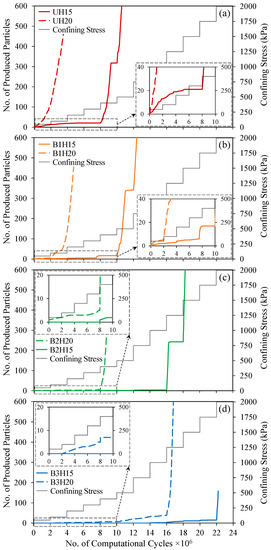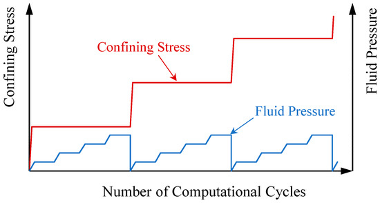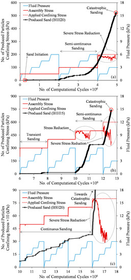 In the sanding simulation, the values of applied confining stresses start from 50 kPa and then increase in steps. Each of these steps lasts for two million DEM computation cycles. During each step, an inward flow is induced by an increasing pressure difference (between inlets and outlets) from zero to 6 kPa. Figure 11 shows the loading and fluid pressure conditions of the models during the simulation schematically. The applied confining stress increases until catastrophic sanding occurs in all models.