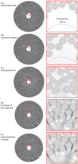 Many experimental studies have been conducted to investigate the sand production mechanism. Regarding unconsolidated sands, primary sand production studies associated the onset of the sand production process with the instability of the sand arch formed near the extraction hole [17,18]. Tippie and Kohlhaas [19] conducted a laboratory study on the effect of flow rate on the arch formation and concluded that the sand arch formation is dependent on fluid flow rate and initial arch size. They also found a new stable (and commonly larger) arch is usually formed after the initial sand arch instability due to excessive flowrate. Yim et al. [20] investigated the effect of fluid pressure, outlet size, and shape of sand particles on the stability of the sand arch. They reported that parameters such as the ratio of grain diameters to cavity size, grain size distribution, and the sand particles’ angularity have a significant effect on the stability of the sand arches.
