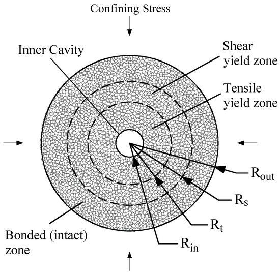 The modeling process for sand production tests starts with the first three steps of the modeling procedure presented in Section 3.2 using the same octagonal particles. After the bond generation, an inner cavity (central hole) with a given diameter was drilled by removing particles, the center of which was located inside the cavity. Both bond generation and drilling steps are conducted under a small constant confining stress of 12.5 kPa (similar to [51,52,53,77,79]). On the one hand, this confining stress ensures a small overlap between contacting particles so that inter-particle bonds can be easily created. On the other hand, its small value prevents the excessive displacements of particles adjacent to the freshly-drilled inner cavity, which were previously in contact with the removed particles. The bond strengths used in sand production tests are similar to bonds used in Section 3.2. The properties of models used in these simulations are presented in Table 3. The various cavity (hole) diameters used in this study are within the common range of perforations used in experimental studies [2,3,28,29]. The inner hole radius is constant during the simulation. The outer radius of the assembly is almost equal to 60 mm so that: (1) The desired numbers of particles (2000 particles) can be generated, and (2) the ratio of outer to inner model radius stays in a typical range found in previous studies [2,3,23,28,29].