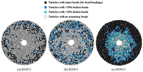 The inter-particle bond in the current computer program, in essence, is a modified contact model between initially contacting particles (at the instant of bond creation). A relatively simple bond model similar to the approach originally proposed by Jiang et al. [51] was used. It is found that this model can efficiently capture the primary mechanical behavior of bonded particles [52,53]. The model adds a bond element into the existing contact model with only tensile and shear resistances. The rolling resistance of bonds is neglected since its value is arguably negligible if the size of the bonds is small enough compared to the particle size [51]. The bonds break irrecoverably once the tensile or shear forces exceed the corresponding strength of the bonds. When in tension, the bond provides an attractive contact force primarily equal to the product of normal stiffness and normal displacement, reaching the tensile bond strength, , at its peak value. Once the bond is broken due to excessive tension, the attractive contact force abruptly drops from to zero. The shear bond contact model behaves somewhat differently. The contact shear force increases linearly with the shear displacement until its peak value, . In the case of shear bond breakage because of excessive shear force, the strength of the contact abruptly drops to the residual frictional strength (defined by the Mohr–Coulomb criterion). The approach is explained in detail by Jiang et al. [51,52]. It is befitting to note that in the current study, for simplicity, the normal and shear bond strength values were assumed to be equal ().