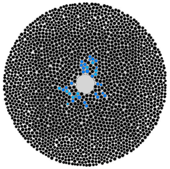 In 2D models of fluid flow through dense particulate media, there is a major issue regarding the pore water flow path. In these conditions, the flow paths are blocked by contacted solid particles, making it difficult for fluid to flow through the media. The hydraulic radius concept was introduced to numerically solve this problem and facilitate fluid flow through adjacent particles in the 2D DEM-LBM models [35]. The hydraulic radius is the virtual radius of a particle in the LBM calculations, smaller than the mechanical (real) radius of the particle. The hydraulic radius multiplier is defined as the ratio of the hydraulic radius to the real particle radius. It should be noted that the hydraulic radius is only applied in LBM (fluid-part) calculations, and the DEM (solid-part) model uses the mechanical (real) radius of the particle [1,40,65,66].