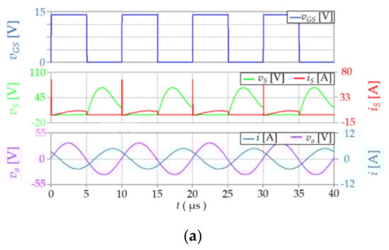 The Class E converter is appropriate for a high-frequency operation, because it can achieve ZVS, and under optimum operation, the voltage derivative is also zero. This last condition is known as the zero derivative switching (ZDS) condition, and it plays a key role to reduce EMI interference [20]. The total harmonic distortion (THD) of the output voltage is very small. For this reason, this converter is one of the best solutions for the realization of inverters with a rated power of up to a few hundred Watts. Additionally, being made up from one single MOSFET, it allows the reduction of the converter cost and dimension and increases its reliability. Moreover, this circuit results in an easy gate drive requirement, because it is composed of a grounded single switch. In this converter, the switch ZVS turns on and high efficiencies are possible if the component values of the resonant circuit are properly chosen [21,22,23].