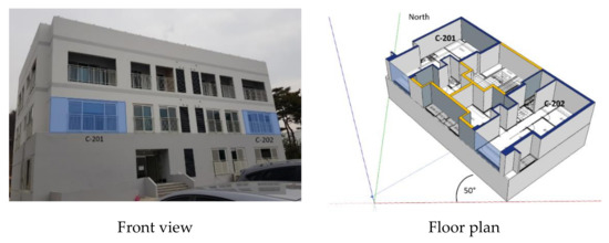 Two households in the apartment were rented for the purpose of measurement, which are indicated as C-201 and C-202 in Figure 1. They are located on the second floor, and the floor plan of the households is provided in Figure 1. The floor area of each household where the measurements were conducted is 52 m2 and the ceiling height is 2.4 m. The exterior wall construction is composed of 100 mm concrete and 145 mm cellular polystyrene insulation. The inner surface of the wall is finished with wallpaper. There is only one type of window in the households. It is an aluminum low-e double-glazed window with a glass thickness of 6.4 mm and an air layer of 6.4 mm. The exterior door is a glade A fire door, which adheres to the standards specified by the law to be used in the apartment houses in Korea. Regular maintenance of these households is conducted by LH. Therefore, the condition is relatively better than the actual apartment houses. The floor plans of the two households are the same and symmetrical to each other. The three surfaces of each household face the outsides. C-201 has the south side, the north side, and the west side facing the outside. C-202 has the south side, the north side, and the east side facing the outside.