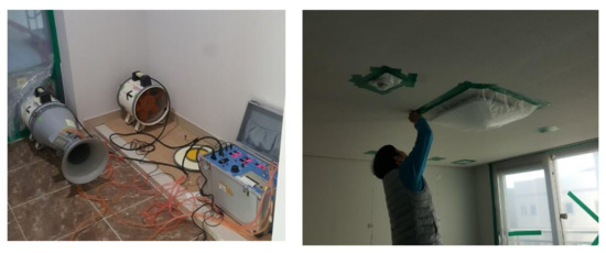 The preliminary measurement was conducted from 3 June 2019 to 7 June 2019 to determine the measurement points for the main measurement. In the preliminary test, the infiltration rate was measured using a blower door tester without air sealing. The next blower door test was conducted after sealing the area through which infiltration was expected to occur. By repeating this process, six cases were selected as the infiltration routes for the main measurement.
