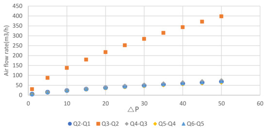 The horizontal axis of the graph in Figure 4 is the change in the pressure difference (Pa), and the vertical axis is the flow rate (m3/h), creating the pressure change. The measured data in Figure 4 can be expressed in the form of Equation (2). However, they were modified to a simple linear regression form by adding log10 to the right and left terms. Thus, the flow coefficient C and pressure exponent n can be easily determined for each case. Using the modified equations, the flow rate differences between each case were found. The relationship between the pressure difference and flow rate difference between each case is shown in Figure 5. In cases other than Q3–Q2, the flow rate profiles according to the pressure difference are similar and overlap, as shown in Figure 5.