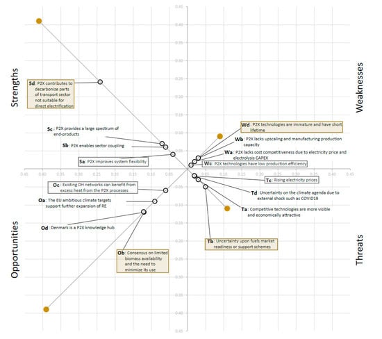 This study provides important insights on the perceptions of 28 Danish experts from both research institutions and industry on the strengths, weaknesses, opportunities, and threats of P2X technology. The main findings of the study could supposedly influence the success of P2X technology in the Danish energy system. The results show that positive factors are considered more important than their negative counterparts, with the only difference in the order assigned to them; the academics stress factors from the strengths category as the most important and practitioners’ opportunities. Both practitioners and academics have two out of three top-rated factors under opportunities. This confirms that they see the potential developments and current frameworks in the surrounding system, in which technology is to be implemented, is more important than the technology-inherent factors.