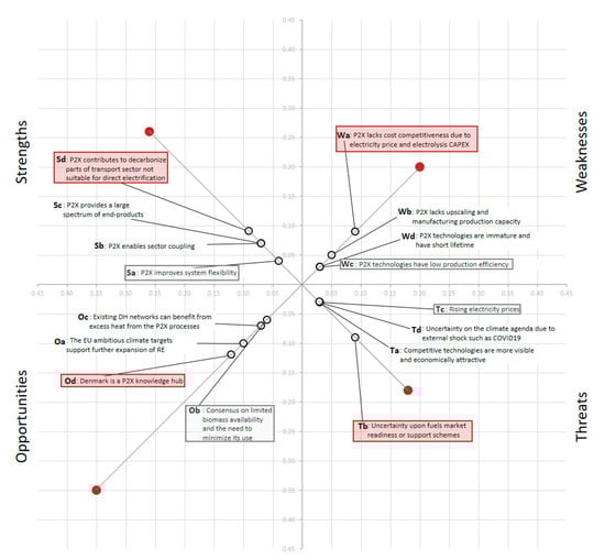 Threats to the P2X technology are seen in competitive technologies that are more visible and economically attractive (Ta), the uncertainty upon fuel market readiness or support schemes (Tb), rising electricity prices (Tc), and finally the uncertainty on the climate agenda due to external shocks such as the COVID 19 pandemic (Td). P2X has to face the competition with other more visible and economically attractive technologies (Ta) that could supersede it to deliver on the climate targets, such as biofuels, or blue hydrogen and carbon capture and storage [51]. Another threat is seen in the uncertainty in the fuel market readiness or support schemes (Tb). In fact, the market framework is not adapted to facilitate the use of electrofuels [41], for which there is currently no certification schemes, and well-established lobbies keep securing support schemes for competing technologies. Moreover, as some experts mentioned as a weakness, P2X technologies efficiency is still rather low and needs large electricity inputs in order to produce fuels. Therefore, if the electricity price from renewables is not low or there is a need for purchasing electricity from the grid with belonging tariffs, there is a risk that P2X cannot become a cost competitive option (Tc) [35], which would be exacerbated if no support scheme is implemented [52]. Denmark however, could potentially, due to the low prices of renewable electricity production produce P2X-products at lower costs than other parts of Europe. In addition, there is always a risk that the climate agenda will be called into question by economic shocks such as that generated by the COVID-19 crisis (Td), sweeping away the opportunities for the development of P2X not only in Denmark but worldwide.