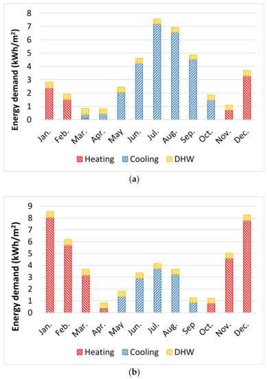 Figure 4 shows the energy demand (heating, cooling and DHW) estimated for the typology of office building in the three locations selected. In all cases, a cooling demand exists throughout the year. This is due to the server room and its high heat gains. In Madrid (Figure 4a), the highest heating demand happened in December and January (3.7 kWh/m2) and was reduced almost to zero in the spring and summer. The cooling demand showed a peak of 5.7 kWh/m2 in July and August. In Berlin (Figure 4b), the highest heating demand occurred in January with a value of 4.2 kWh/m2. The cooling demand in the summer was relatively high (reaching 7 kWh/m2 in July) especially when compared with Madrid but this was mainly due to the significantly higher g-value of the glasses in Germany. This fact in conjunction with the large window area led to high solar gains and thus to a higher cooling demand. In this context, heating in the summer was not needed. Figure 4c shows the energy demand in office buildings located in Helsinki. In this case, similar conclusions can be drawn. A cooling demand is required throughout the year but to a lesser degree (up to 5.2 kWh/m2 in July) because of the much colder weather. The heating demand reached a maximum in January (4.7 kWh/m2). In all locations, the calculated DHW demand was almost constant throughout the year and corresponded to a value of around 0.5 kWh/m2 per month.