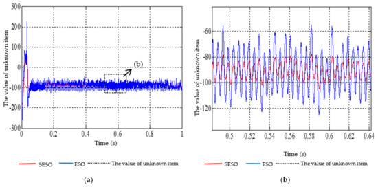 The following comparative simulation is first carried out to display the influence of the smoothing and derivable function. Figure 3 compares the time response curves of the same unknown item value with the improved SESO and the traditional ESO. Figure 3a shows that both the traditional ESO and the improved SESO can estimate the unknown item value well. However, it can be seen obviously from Figure 3b that the improved SESO has a better ability to suppress the high-frequency flutter phenomenon than the traditional ESO.