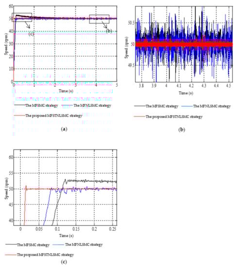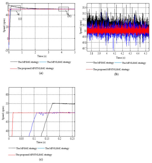 To compare the various controllers’ performance, the reference speed (50 rpm) and the simulation time (5 s) are initial parameters. Based on different control schemes, the speed response curves of the PMSM with and without load starting and stable operation, are compared in Figure 4 and Figure 5, respectively. From Figure 4a and Figure 5a, the adjustment time of the proposed MFSTNLSMC strategy is the shortest, in contrast with the MFSMC strategy and the MFNLSMC strategy. It clearly reveals that the proposed MFSTNLSMC strategy has the optimal transient performance. From Figure 4b and Figure 5b, we also can obviously conclude that it is significant for the proposed MFSTNLSMC strategy to eliminate the chattering phenomenon.