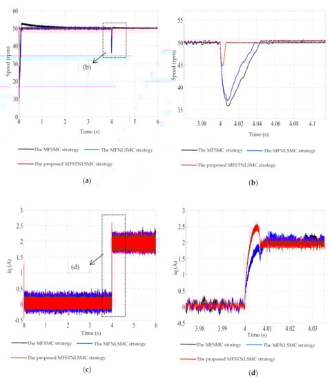 To further check the anti-disturbance performance of the proposed MFSTNLSMC strategy, the external load is changed suddenly, which becomes from at 4 s. As shown in Table 5, the speed perturbation and the speed recovery time of different control strategies due to sudden load change, are compared. Figure 6 shows the speed response contrastive curves and the circuit response curves of the q axis of different control strategies under the sudden load change. It can be seen from Table 5 and Figure 6, the shortest recovery time and the smallest perturbation amplitude are all gotten by the proposed MFSTNLSMC strategy, which indicates that the proposed MFSTNLSMC strategy has stronger robustness.