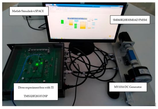 Aimed to further check on the effectiveness of the proposed MFSTNLSMC strategy, a cSPACE (Control signal process and control engineering) based PMSM speed control experimental platform was applied in this paper. The cSPACE experimental platform was produced by Hedong Intelligent Company in Hefei, China. The cSPACE experimental platform of the PMSM drive system consisted of four basic components, which are shown in Figure 7. A SM060R20B30M0AD PMSM, a Matlab/Simulink+cSPACE, a diver experiment box with TI TMS320F28335 DSP, and a MY1016 DC Generator were selected in the experiment. The Matlab/Simulink software is a math software from American Mathworks Company. In order to verify the wider applicability of the proposed control strategy, the motor selected in the experimental verification was different from the motor used in the simulation verification. The key PMSM parameters used in the experiment are listed: rated power is ; stator inductance is ; stator resistance is 0.33 ; rated speed is ; rotational inertia is and flux linkage is . The sampling time of the speed loop is set to 0.001s, and the switching frequency is 15KHz. A rotary encoder is used to measure the speed variable of the PMSM. The current is detected by the Hall current sensor. The bus voltage is transmitted to the A/D port of the DSP after the voltage is distributed by the resistances to complete the detection.