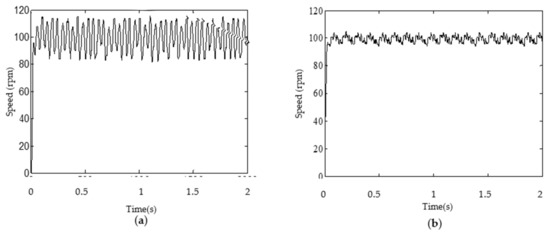 (a) The experimental speed response curve of tracking the aim speed 100rpm under the MFSMC strategy; (b) The experimental speed response curve of tracking the aim speed 100 rpm under the proposed MFSTNLSMC strategy.