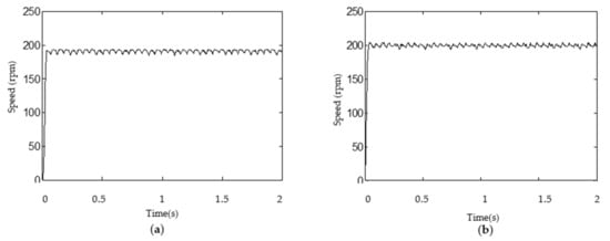 (a) The experimental speed response curve of tracking the aim speed 200 rpm under the MFSMC strategy; (b) The experimental speed response curve of tracking the aim speed 200 rpm under the proposed MFSTNLSMC strategy.