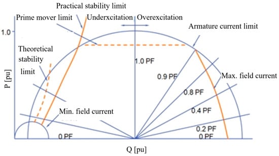 The operating region within which the synchronous generator (SG) can operate safely is called the capability curve (Figure 3). Capability curves, provided by manufacturers, are used to optimally exploit synchronous machines during their lifetime. In fact, protection systems based on capability curves safeguard the machine from being thermally overloaded or operated near static/dynamic stability limits. As shown in Figure 3, capability curves are usually given in the P-Q plane where the most important limitations are plotted—stator and rotor current limits, static and dynamic stability limits and thermal restrictions [38]. As SGs are the most valuable sources of reactive power in the power systems they are often operated in the overexcited region, thus having only a limited amount of reactive reserve capability.