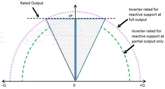 Some interconnection standards reviewed in [43,44], applicable to large-scale transmission-connected PV plants, describe reactive capability requirements as “triangular,” “rectangular” or with a similar reactive capability characteristic, as presented in Figure 4.