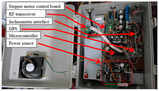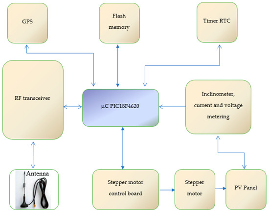 As a project concept, a multitracker system was adopted within a (remotely) supervised-module architecture. The role of processing the most complex data is done by the software in a desktop computer, which controls the tracker through the firmware setup. On the other hand, the tracker module, Figure 1, was in charge of rotating the PV panel built within a polar geometry, where the axis tilt is the latitude of the local, following the movement of the sun (east–west) while storing the energy collected as output of three previously conceived tracking strategies. That task was done with the help of a microcontroller (PIC18F4620) and its firmware that handle some electronic modules: a stepper motor control board, a GPS unit, a flash memory chip, an inclinometer sensor and a radio frequency (RF) transceiver by which data can be exchanged between the tracker module and the supervisor (desktop computer). Such a scheme of control can be seen in the flowchart of the Figure 2. The configuration of the tracker and the update of the firmware could be remotely done when necessary. As could be expected, a RF transceiver module counterpart, Figure 3, was connected to the desktop computer. In Figure 4, the electronics behind the flowchart can be observed. Finally, the supervisor software in the computer was written in the languages C++ and C#, while the firmware in the tracker was written in the assembler and C.