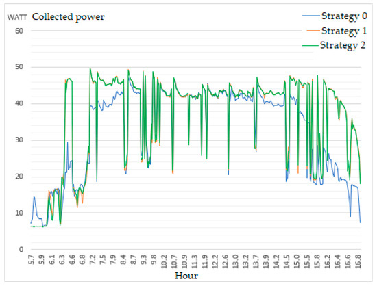 Then, the relative (average) loss of power of strategy 1 compared with 2 can be evaluated by Equation (16) above. It is opportune to observe that it could be understood as a comparison on a daily basis in each segment of arc of the strategy 1, given that the declination is the same for both strategies. This geometric loss due to the seven positions can be calculated by taking into account that the maximum tracking error, , was about 12°. This represents a loss of, approximately, 0.73%, which explains the fact that no significant difference had been observed between strategies 1 and 2. Indeed, 0.73% in loss would be equivalent to a constant tracking error of 6.92°, almost half of 12°. It is also worth noting that seven positions meant a movement each 1 h and 36 min.