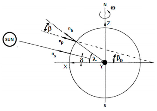 Starting from the Figure 8, it can be shown that the sun ray unity vector, , can be expressed in the form:
