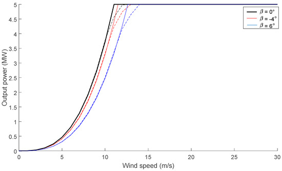 In this way, the power curve obtained by Equation (12) without considering turbulence (usually referred to as zero-turbulence power curve) is corrected by taking into account the effect of fluctuations in wind speed induced by turbulence. In practical terms, the consideration of turbulence in the power generation model of a WT results in a slight increase in output for below-nominal operating conditions and a lower output for wind speeds in the transition zone (just below nominal the rated speed). This effect can be seen in Figure 2 by the dotted curves representing the corrected power curves considering the turbulence intensity for operation at each of the pitch angles shown in this example.