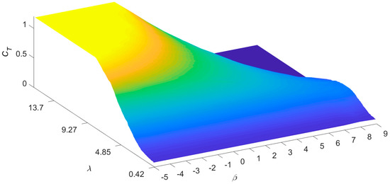 Thrust coefficient, CT, depending on the pitch angle, β, and the tip speed ratio, λ, for the NREL 5 MW reference WT.