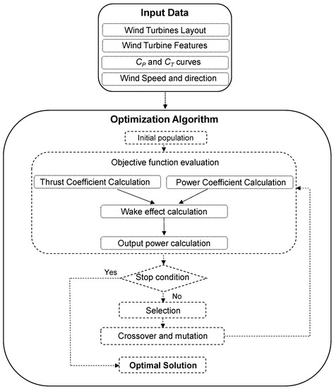Figure 4 shows in a schematic way the flowchart of the proposed methodology. As can be seen, the input data required are composed of the layout of the WTs of the studied WF, the features of the WT model, including the power and thrust coefficient curves, and the wind data. All these data are used to evaluate the output power yielded by the WF when each WT has a certain operating configuration.