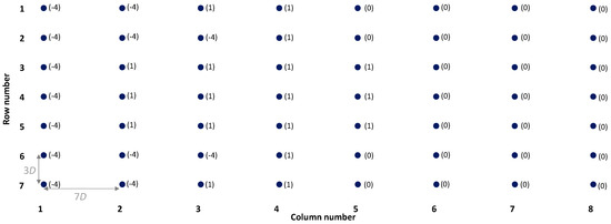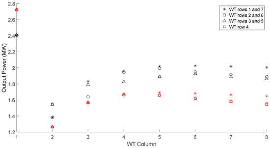 Figure 6 shows a comparison of the results obtained by the classical pitching strategy operating at maximum power coefficient (markers in black) and by the optimized pitching strategy proposed in this paper (markers in red). As can be seen, the optimized strategy obtains less power generated for the first WT column (subject to free flow) than for the classical strategy operating at maximum power coefficient. This lower power produced by the optimized strategy in the first column is compensated by a higher output in the following columns (whose airflow is indeed disturbed by the effect of upstream wakes) compared to the classical strategy. The power produced in this situation by means of the solution obtained with the proposed algorithm is 106.92 MW, whereas with the classic setting it would be 95.96 MW, which represents an improvement of 11.42% obtained by means of the optimised solution proposed in this work. Finally, it should also be pointed out that, as the layout of the turbines is orthogonal and the wind direction is perpendicular to the columns, the solution obtained is symmetrical with respect to the central row (i.e., the fourth row), so that the resulting wind speed field is also symmetrical and, therefore, for the same column the power obtained by the turbine corresponding to rows 1 and 7 are identical. The same is true for rows 2 and 6, as well as 3 and 5, respectively.