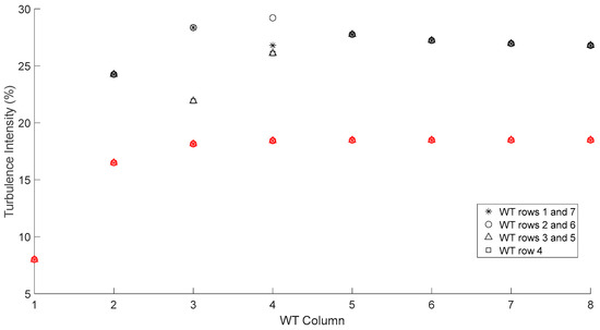 Turbulence intensity in the inflow of each wind turbine using the classic pitching strategy (markers in red) and the optimised pitching strategy proposed in this paper (markers in black).