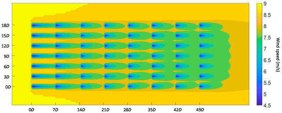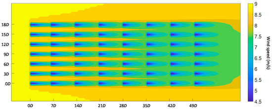 Figure 8 shows the wind speed field resulting from the application of the proposed strategy while Figure 9 shows the wind speed field corresponding to the classical strategy (consisting of operating all the turbines at maximum power coefficient). As can be seen, with the optimised strategy, the wind speed for the turbines located downstream is higher than that corresponding to the case of operation at maximum CP. This is a consequence of the operation at derated power in the first WT columns at the same time as the pitch at which they are operated increases the turbulence, which favours the recovery of the wake and, consequently, allows greater production to be achieved by the WTs located downstream.