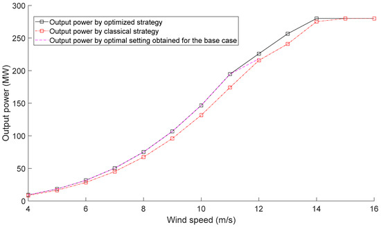 For wind speeds between the cut-in speed and 11 m/s, the increase in power output follows a cubic relationship as a function of wind speed, with the higher the wind speed, the greater the increase in power output obtained by the proposed methodology. Likewise, the output power that would be obtained keeping constant the optimal setting obtained for the base case has also been plotted in Figure 10 (represented by the cyan line in the figure). As can be seen, for wind speeds equal to or lower than 11 m/s, the solution obtained for the base case is the same as the optimal solution obtained for each wind speed (in other words, the optimal setting remains constant for speeds equal to or lower than 11 m/s). For a speed of 12 m/s the configuration obtained for the base case would provide an output power similar to that of the classical approach, while for speeds above 12 m/s the base case solution would not be feasible, as some WTs would exceed the nominal operating conditions. On the other hand, for the speed range between 12–14 m/s, the increase in power generated as a function of wind speed no longer follows a cubic trend, mainly as a consequence of the operation of most WTs in transition zone, where the effect of turbulence on the power curve makes the power output lower than would correspond to the zero-turbulence power curve (as can be seen in Figure 2).