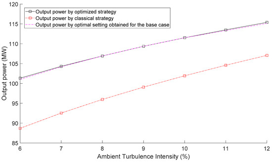 Figure 11 shows the results obtained by modifying the ambient turbulence intensity within the range of 6–12% while maintaining the rest of the variables equal to those defined in the base case (i.e., 9 m/s wind speed and west wind direction). The proposed algorithm also provides a higher power output during the whole range of turbulence intensities analysed, with the differences being greater as the turbulence intensities are lower. This is due to the fact that, for moderate turbulence intensities, the effect of the turbulence induced by the wakes operating with the proposed strategy is proportionally more relevant to the ambient turbulence, which allows a faster recovery of the wind speed along the wake. In this case, the sensitivity analysis has provided slightly different pitch angle settings for the WTs depending on the ambient turbulence intensity. However, in all cases, the first column of wind turbines is operated in pitch-to-stall mode with β = −4°. The greatest differences in pitch setting have been obtained mainly for the lower turbulence intensities, in which all the WTs in the second column are operated in pitch-to-feather mode with a pitch angle of β = 1° (as opposed to the setting obtained in the base case in which turbines 1, 2, 6, and 7 in the second row are operated in pitch-to-stall mode). Likewise, as it can be seen, the optimum configuration of the base case is relatively stable as the turbulence intensity is modified, obtaining an output power very similar to that obtained by the solution optimised for each turbulence intensity.