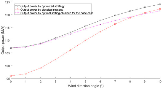 As can be seen, as the angle of the incoming wind direction increases, the lower the power increase obtained with the approach proposed in this work with respect to the classical approach. This is a consequence of the fact that as the angle increases, the rows of wind turbines are less aligned with the incoming wind direction, which reduces the effect of the global wake effect and, therefore, the potential gain of the approach proposed in this work. As can be seen, the optimal configuration changes depending on the angle of the wind direction. However, it is also important to note that the setting obtained for the base case (represented in the figure by the cyan line) outperforms the configuration of the classical approach within the range 0–8°, which shows a relatively stable behaviour of the optimal solution against moderate variations in the incoming wind direction.