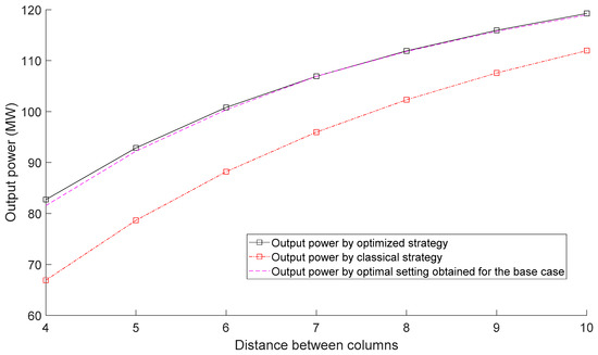 As can be seen in Figure 13, the closer the WT columns are, the greater the increase in output power obtained by the optimized strategy. This is a consequence of a greater role of losses due to wake effect when the WTs are closer to each other, which allows the optimized strategy proposed in this paper to minimize overall losses by increasing turbulence through at derated power operation of the upstream WT columns. On the contrary, as the distance between the columns increases, the speed in the wake has a greater margin of recovery, so that the gain obtained by the proposed strategy as opposed to the classical approach is progressively reduced.