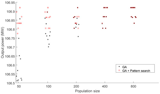 This section shows a behavioural analysis of the proposed optimisation algorithm. Genetic algorithms do not guarantee convergence to the global optimal solution, since they are founded on metaheuristic optimisation techniques based on the successive generation and evaluation of potential solutions that are generated by means of random search operators. Therefore, 10 runs of the genetic algorithm have been carried out (considering the base case) for different population sizes, starting from a minimum size of 50 individuals and successively doubling the population size until reaching 800 individuals. The results obtained in this sensitivity analysis are shown in Figure 14 by means of the black stars. As can be seen, for small population sizes, the dispersion in the fitness of the solution provided by the algorithm is high, while as the population increases this dispersion is smaller and more concentrated around the global optimum. It is important to note that, although for a population of 800 individuals the GA does not always converge to the same solution, all the solutions provided are very close to the global maximum and with differences in fitness of less than 0.1%.