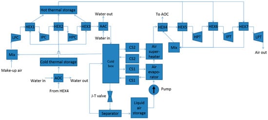 Schematic chart of the analyzed Adiabatic Liquid Air Energy Storage (A-LAES) system. Abbreviations: HEX—heat exchanger; AAC—additional air cooler; AOC—additional oil cooler; LPC, IPC, HPC—low, intermediate, high-pressure compressor; LPT, IPT, HPT—low, intermediate, high-pressure turbine; CS—cold storage; J-T—Joule–Thompson.