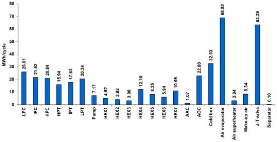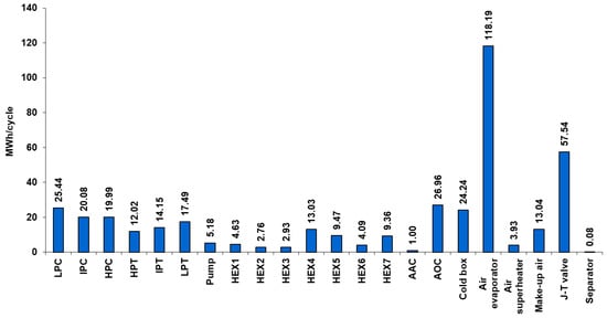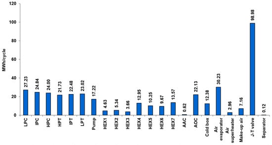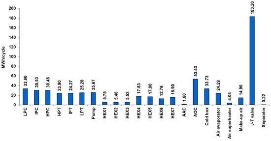 As in the previous case for case II, the greatest destruction of exergy for this case occurs at the air evaporator and then at the J-T valve. However, this difference is insignificant. Other important sources of exergy destruction are: cold box, low-pressure compressor part, cooler 2, medium and high-pressure compressor part, individual turbine parts, HEX4, and HEX7. The destruction of exergy in other elements of the system is less significant.