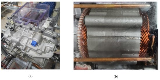 Figure 1 shows the target motor used in the experiment. The target motor is a General Motors Chevrolet’s ‘Bolt EV’ motor currently used in their EVs. This motor is a permanent magnet synchronous motor (PMSM) that uses a hairpin winding. The motor has a peak torque of 360 Nm and a peak power of 150 kW. Figure 1a is a picture of the motor assembly. The overall length of the motor assembly is 530 mm, and the height is 316 mm. The motor assembly is an integrated motor and reducer. The part with acrylic housing for flow visualization is the motor. The upper part of the motor housing is made of acrylic to enable the observation of the flow of oil in the motor’s stator and coil. The part next to the motor is the reducer. The width of the motor is 235 mm, and the width of the reducer is 430 mm. Figure 1b is a picture of the stator and coil, which are the main parts of the motor. The length of the stator is 180 mm, and the outer diameter is 204 mm. There are six coil conductors between each tooth of the stator. The end-winding on the left side of the motor is called the welded part, and the end-winding on the right side is called the crown part. Unlike the crown part, the welded part has white insulating paper between the coils.